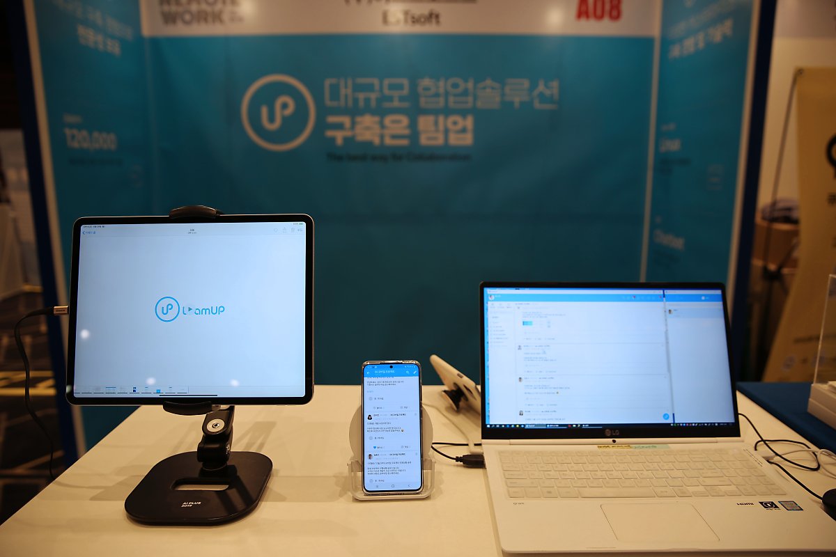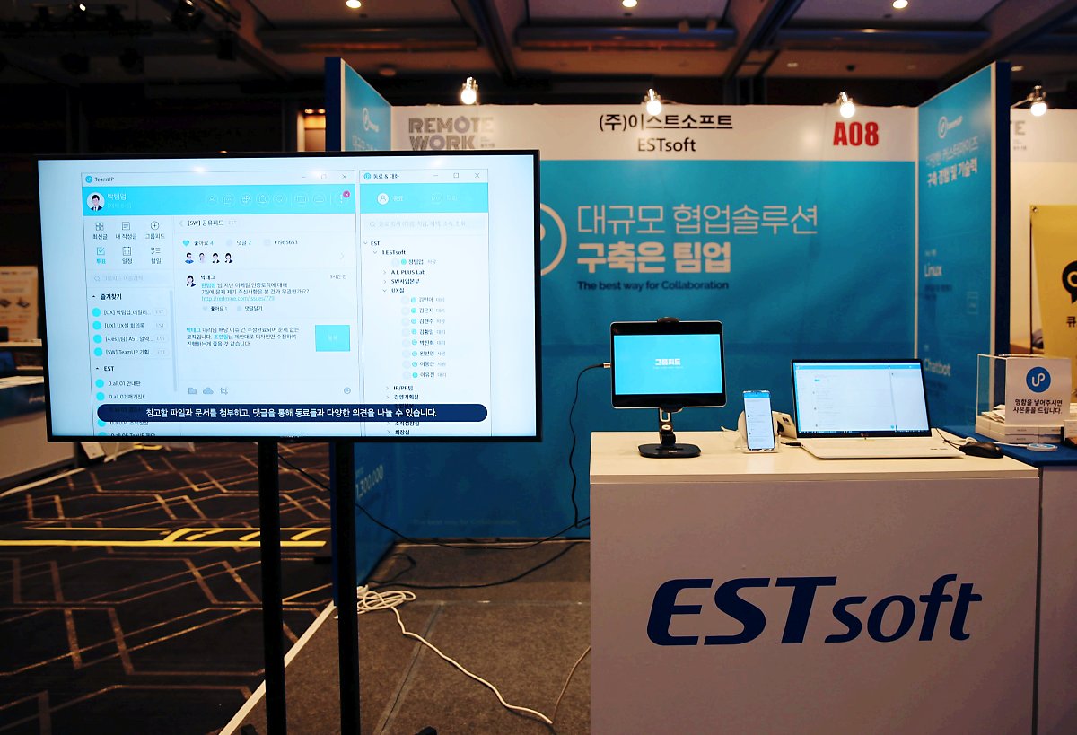 이번 행사에는 화상회의, 협업툴 등 원격근무 환경에 필수적인 솔루션을 제공하는 약 20여 개의 업체가 참여했는데요. 이중, 이스트소프트도 참가해 기업용 협업 솔루션 '팀업(TeamUP)'을 선보였습니다. 생생한 현장 모습을 사진으로 담아왔는데요! 지금 바로, 살펴볼까요?