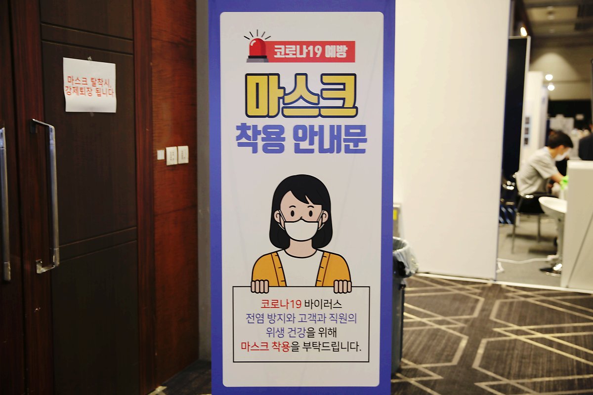 우선 이번 행사에서는 입장 등록 시 지급되는 비닐장갑부터 체온 체크, 마스크 필수 착용 등 코로나19 예방을 위해 신경 쓴 부분들이 눈에 띄었는데요! 전시장 내부에도 마스크 착용 안내문이 곳곳에 있었습니다.