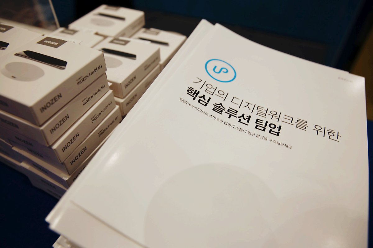 이날 부스에는 팀업의 여러 기능을 직접 써볼 수 있는 PC, 태블릿PC, 스마트폰 기기가 비치되어 있었는데요! 원격근무 솔루션의 도입을 고려하는 여러 기업의 담당자분들을 대상으로, 팀업 담당자가 직접 시연과 함께 실제 업무에 적용 가능한 노하우를 설명하는 시간을 가졌습니다.