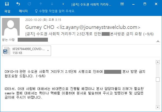 현재 이 악성 이메일은 불특정 다수의 기업 관계자를 대상으로 유포되고 있는데요. 구체적인 내용은 수도권 사회적 거리두기 2.5단계 조치에 따라, 특정 기업의 본사 방문 제한 협조를 요청하는 내용입니다.