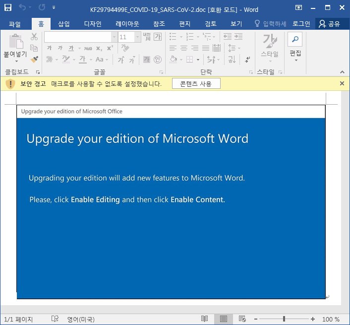 ESRC 분석 결과, 이번 공격에는 악성 문서 파일(파일명 : KF29794499E_COVID-19_SARS-CoV-2.doc)이 첨부되어 있어, 관련 파일을 실행하지 않는 것이 중요합니다.