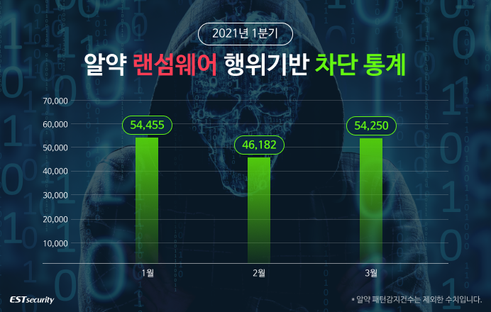실제 이스트시큐리티가 발표한 랜섬웨어 통계 자료에 따르면, 2021년 1분기 알약을 통해 차단된 랜섬웨어 공격은 총 15만4887건에 달한다고 하는데요! 이를 일간 기준으로 환산하면 일평균 약 1720건의 랜섬웨어 공격이 차단된 것으로 볼 수 있습니다.